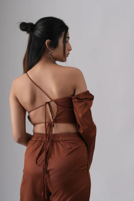 Upgrade your style with this elegant designer co-ord set, featuring a one off-shoulder top with a back-open design, paired with stylish pants.