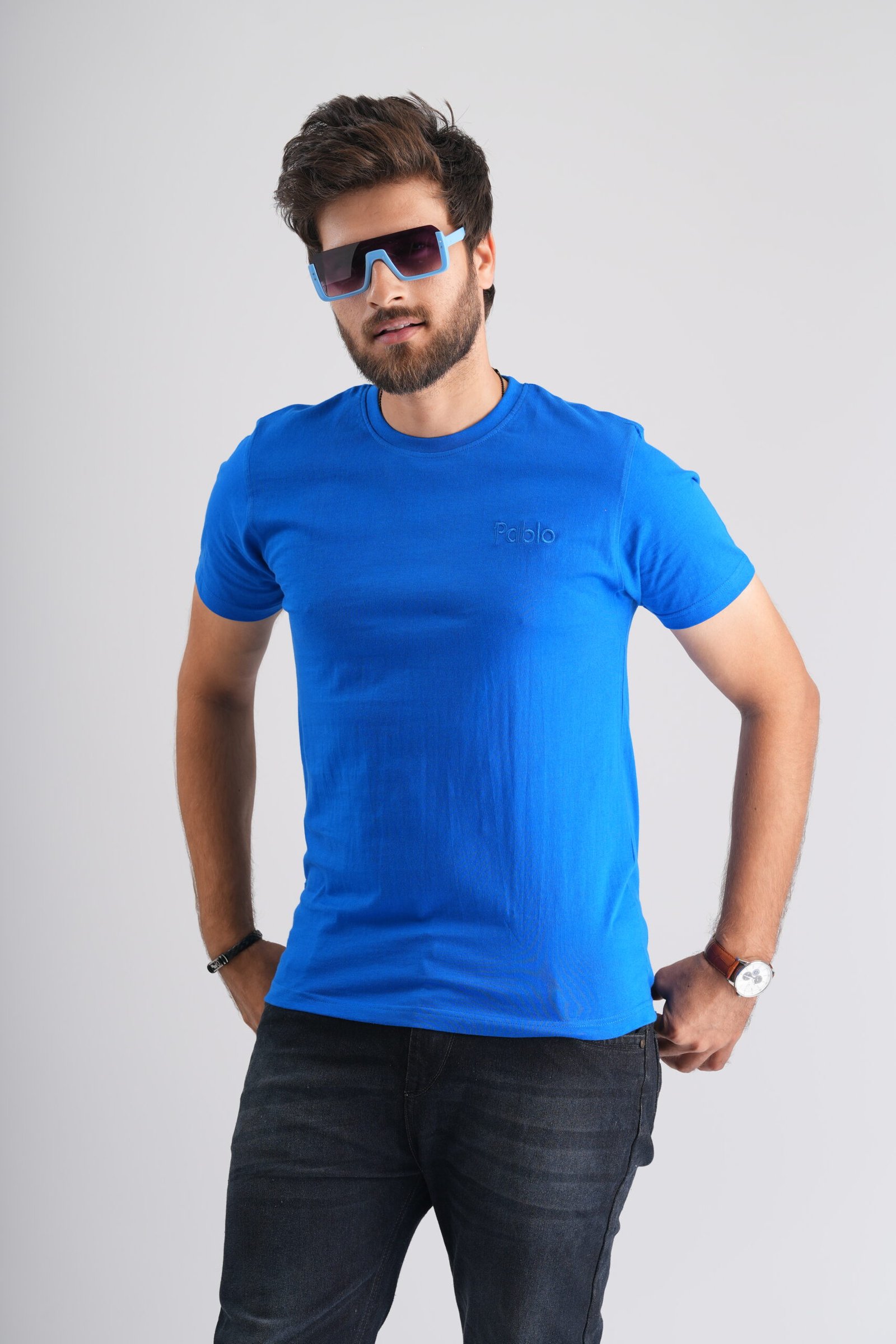 | Stay effortlessly cool with our Blue Round Neck T-Shirt. The Pablo embroidery adds a hint of sophistication to this classic blue tee. |