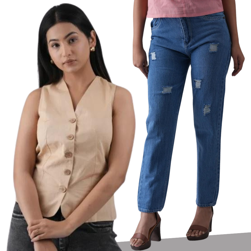 Ivory Sleeveless Waistcoat with Dark Blue Relax Fit Women’s Jeans