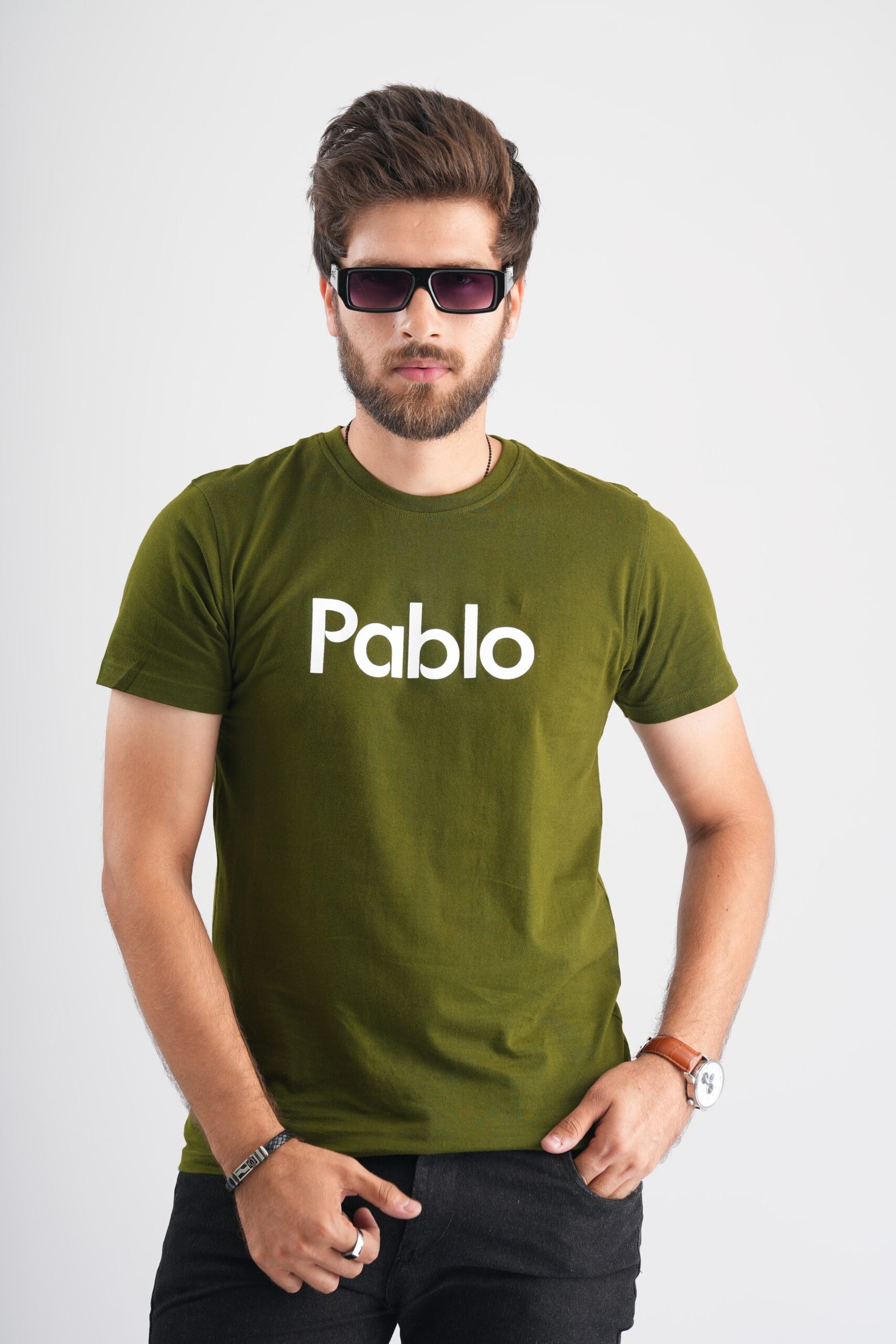 | Product Details: This Military Green Round Neck T-Shirt adds vibrancy to your casual wardrobe and showcases intricate Pablo embroidery.
