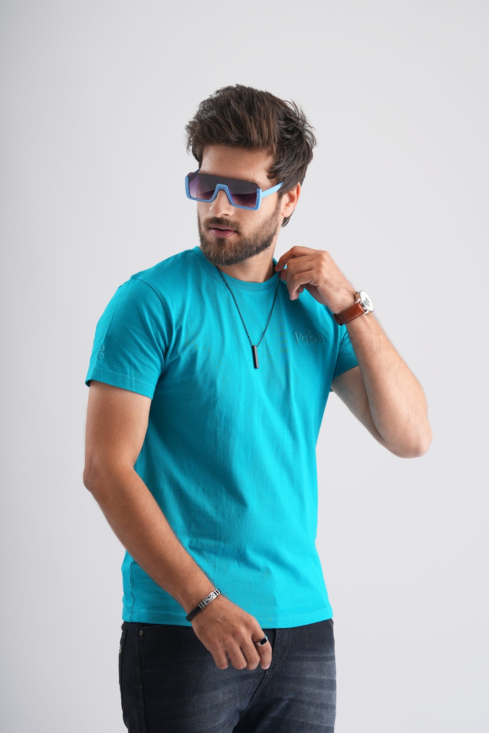 | Product Details: This Sky Blue Round Neck T-Shirt adds vibrancy to your casual wardrobe and showcases intricate Pablo embroidery.
