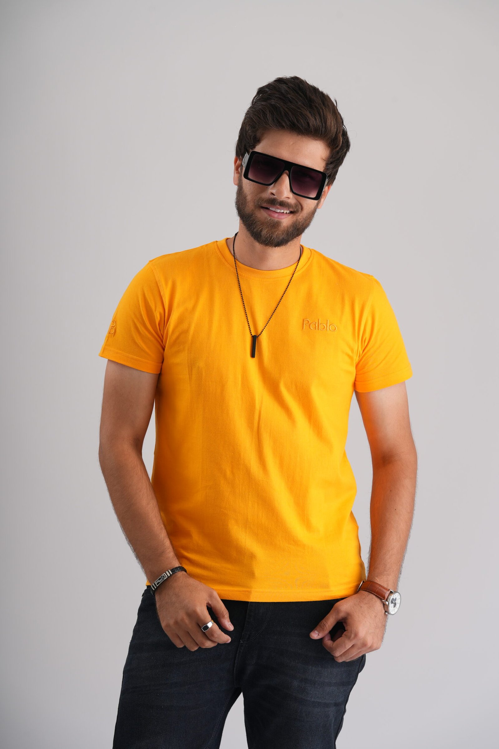 | Product Details: This Yellow Round Neck T-Shirt adds vibrancy to your casual wardrobe and showcases intricate Pablo embroidery.